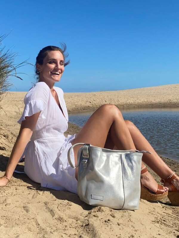 Cartera en cuero natural, totalmente forrada, con cierre. Medidas 35 cm de ancho, 34 de altura, fuelle 11 cm.Dos compartimentos, uno diseñado para laptop, con dos bolsillos internos.Bolsillo externo con cierre. 2 tipos de correas, para colgar y otra ajustable y desmontable.